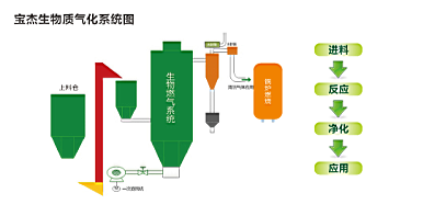 生物質發生不完全燃燒,生成的是一氧化碳、氫氣和低分字烴類氣體等可燃氣。氣化過程中的不完全燃燒提供的熱量主要供給原料進行干燥、升溫和裂解需要,原料中大部分的化學能從固態載體轉化為氣態載體,氣化后得到的可燃氣通過再燃燒后,將進一步釋放出其本身具有的熱能。